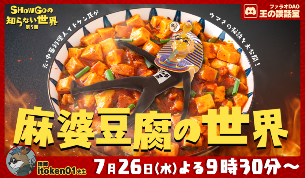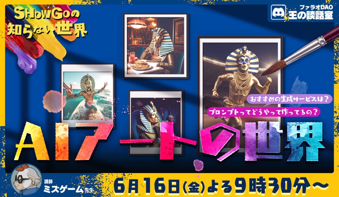 ファラオDAOのメンバーが、自分の得意なことをプレゼンする不定期イベント バンドザウルスミニでも何度も作品が選出されたミズゲームさんの「AIアートの世界」をどうぞ!(2023年6月放送 2:30:00) イトケンさんによる絶品麻婆豆腐の世界!一緒に作りながら見るのがおススメ!(2023年7月放送 1:33:00 )近日公開!!